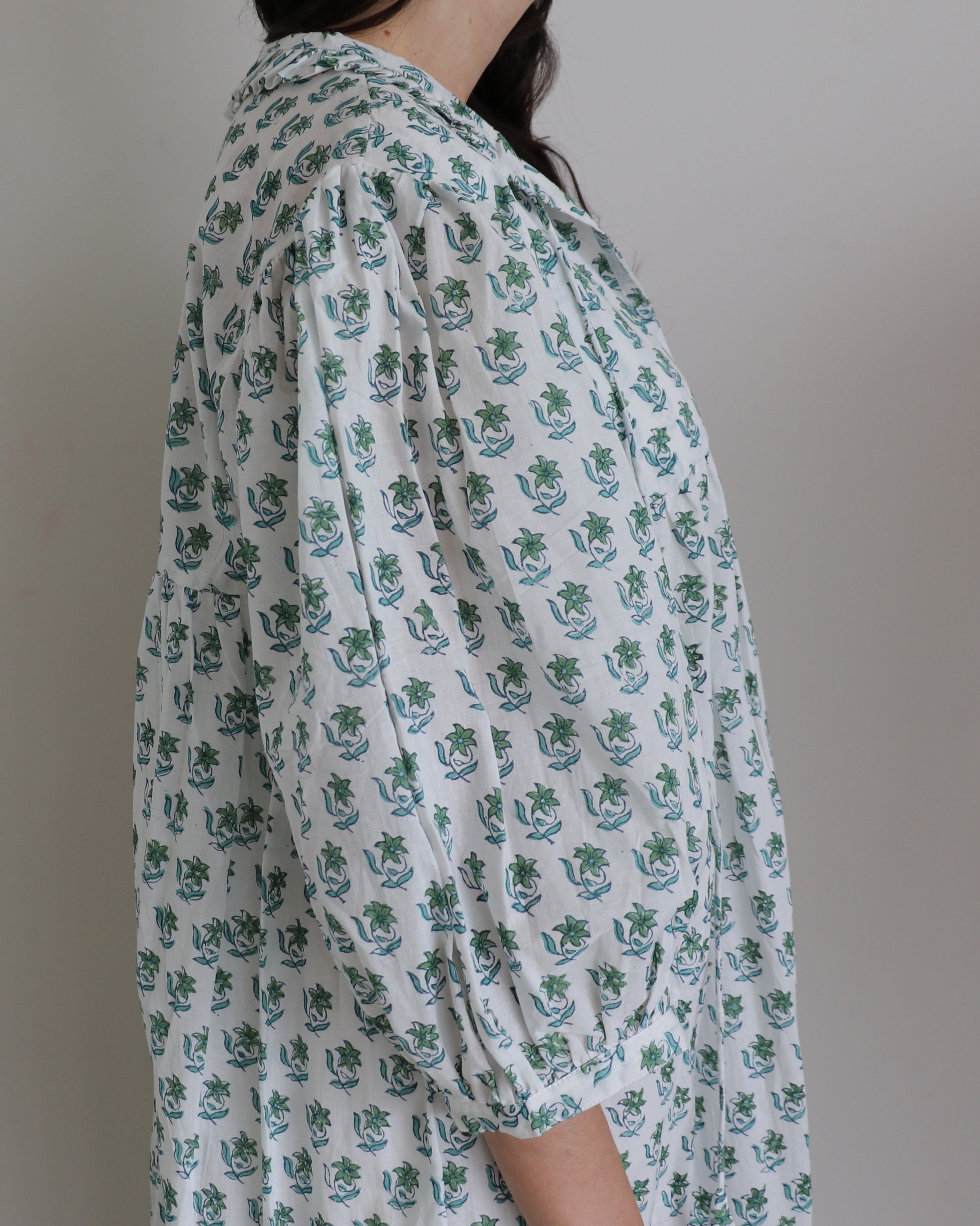 The Elena Dress is handcrafted from lightweight 100% cotton, it features a delicate, dainty floral pattern block printed by hand, each detail adding to its unique charm.