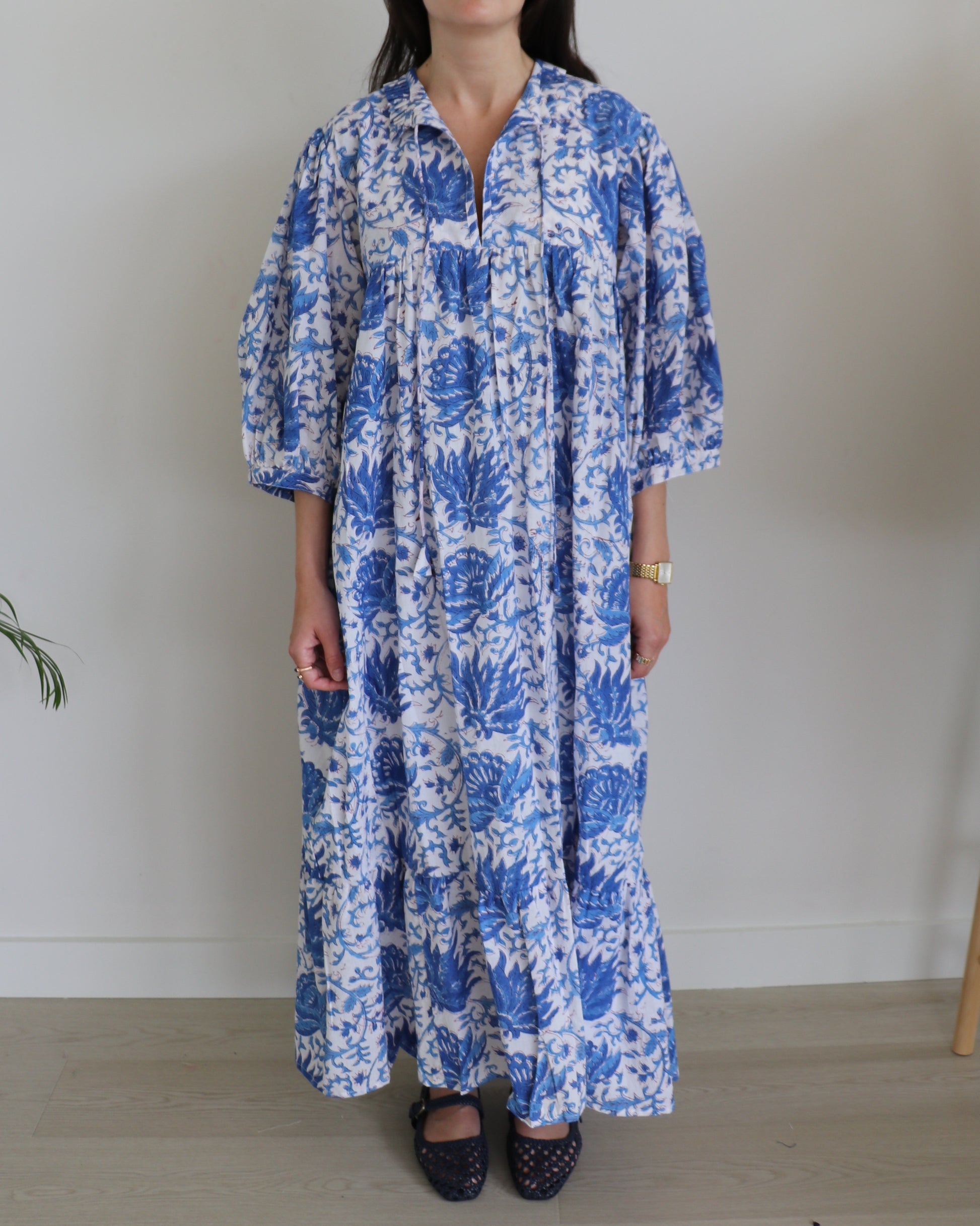 Effortlessly elegant, the Mara Dress features a delicate blue floral pattern block printed by hand onto 100% lightweight cotton. Its flowing silhouette and airy sleeves make it an ideal choice for warm days or relaxed evenings.